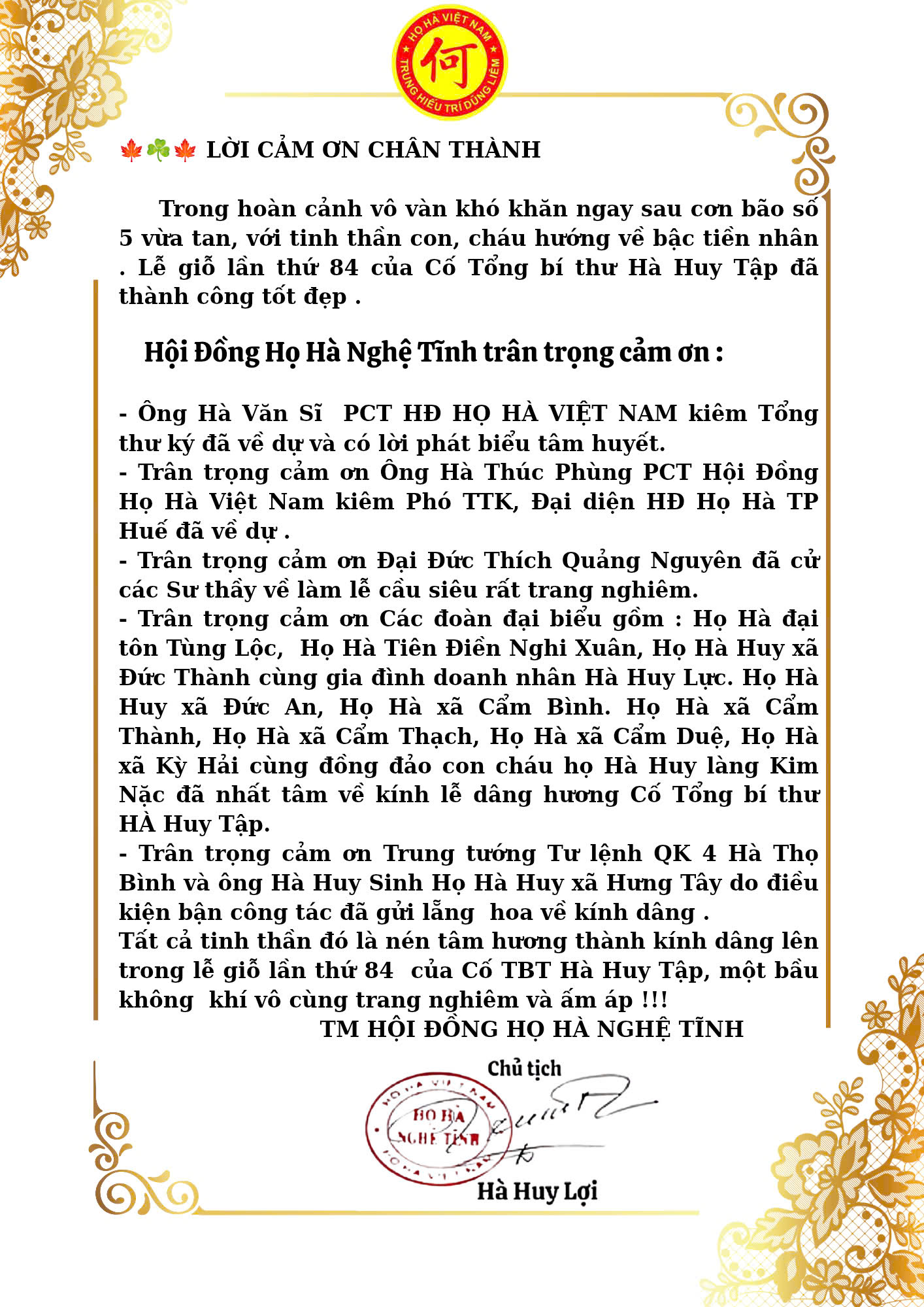 HỘI ĐỒNG HỌ HÀ NGHỆ TĨNH LỜI CẢM ƠN SAU LỄ GIỖ LẦN THỨ 84 CỐ TỔNG BÍ THƯ HÀ HUY TẬP