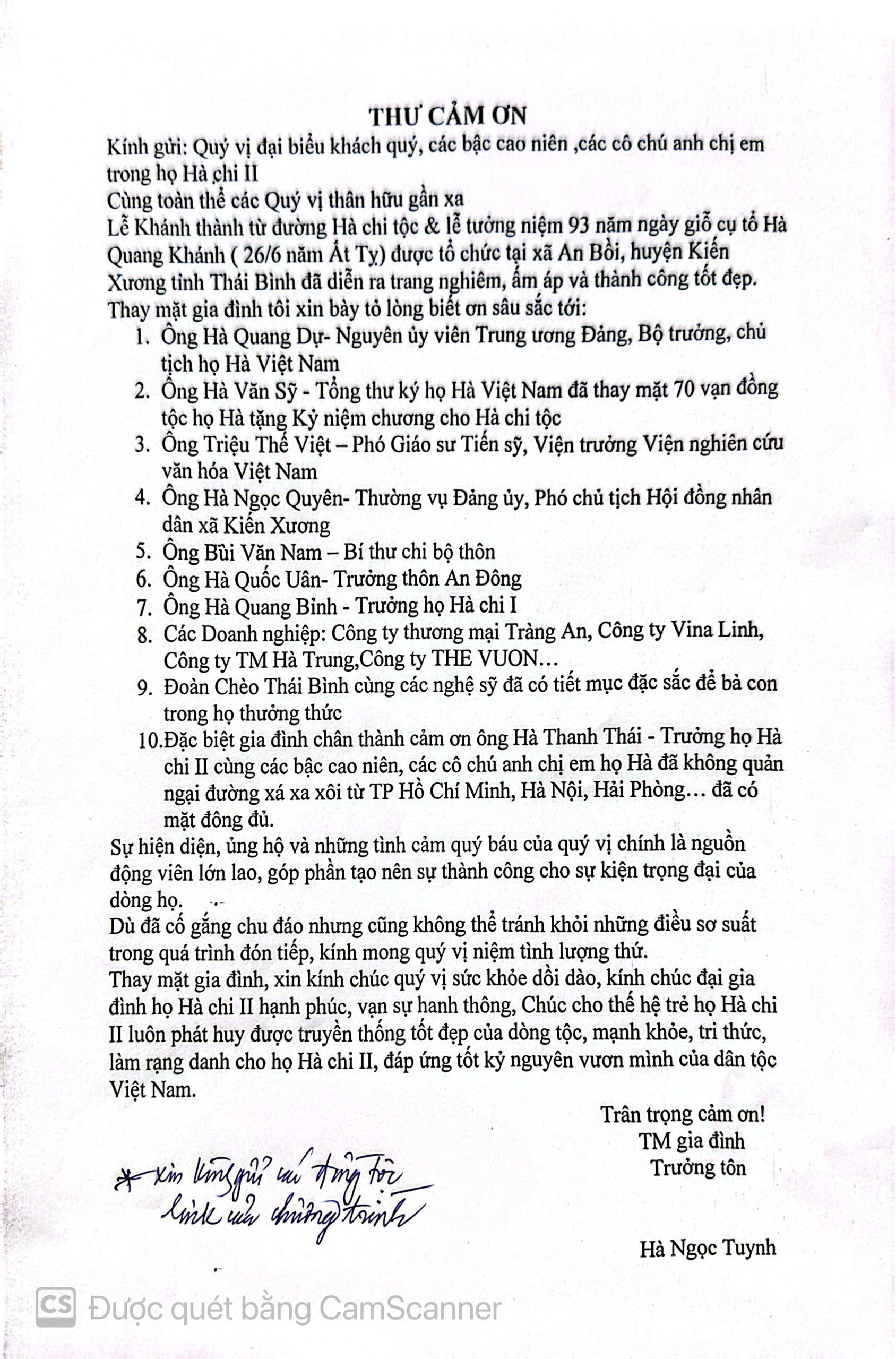 Nhân dịp này, lãnh đạo Hội đồng Họ Hà Việt Nam đã gửi lời chúc mừng, ghi nhận và biểu dương những nỗ lực của Hà Chi Tộc trong công tác xây dựng Từ đường, đồng thời bày tỏ mong muốn bà con tiếp tục phát huy truyền thống hiếu nghĩa, gắn kết dòng tộc, đóng góp tích cực cho sự phát triển chung của họ Hà Việt Nam trong thời kỳ mới.
